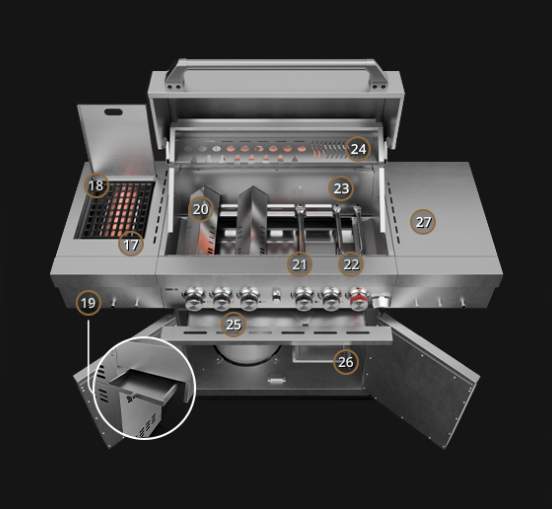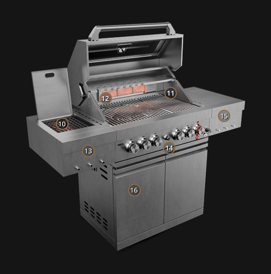 Гриль лучший в своем классе. Профессионал в каждом дюйме и во всех отношениях. Он был полностью изготовлен из 304 из нержавеющей стали, то есть использованной в профессиональной гастрономии. Внутри есть мощные горелки с системой ароматизаторов. Газовое пламя нагревает посуду, расположенные на стальных решетках (верхних и нижних), приготовляя твердые порции мяса, колбас, ребрышки и шею, а также нежные морепродукты, овощи и хрустящий хлеб.